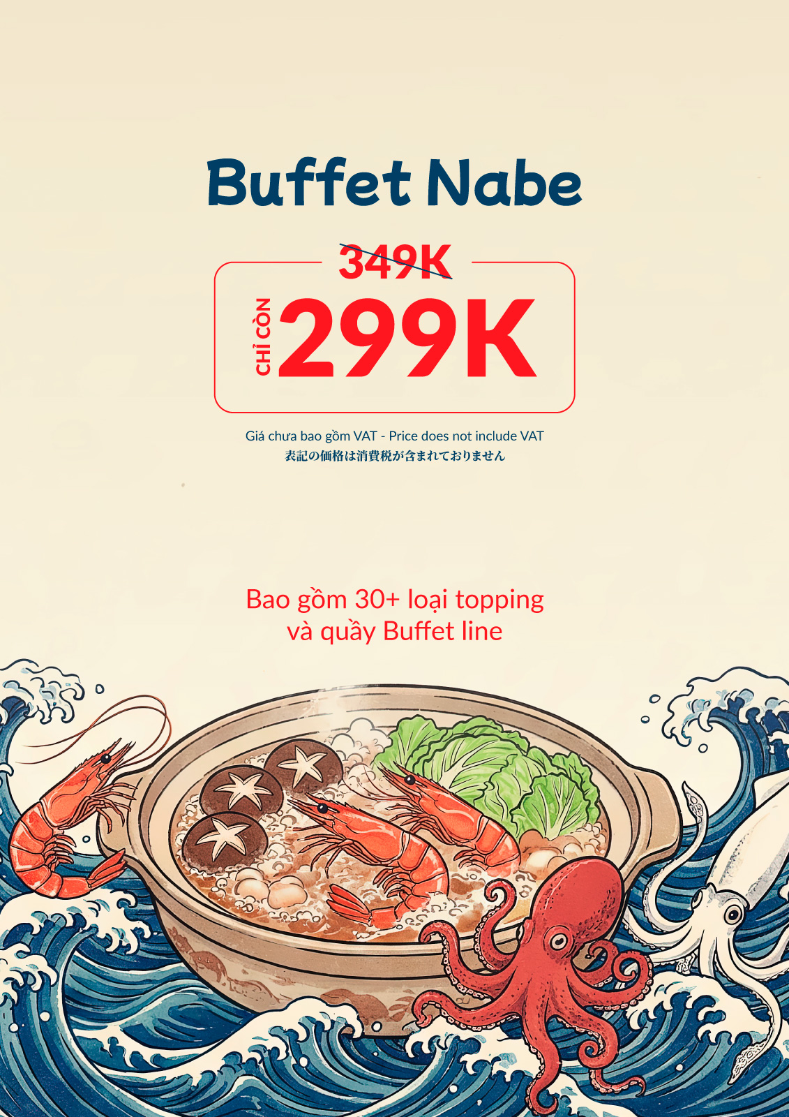 Buffet Lẩu (Nabe): Chỉ còn 299.000 VNĐ/người (Giá gốc: 349.000 VNĐ).