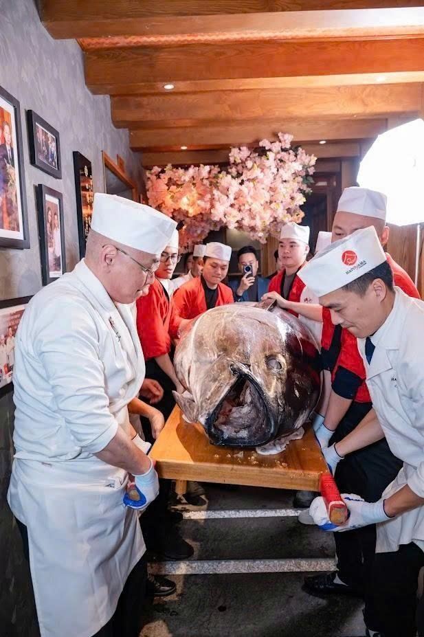 Khoảnh khắc 8 bếp trưởng tài hoa cùng nhau rước chú cá khổng lồ lên sân khấu đã khiến tất cả thực khách như vỡ òa cảm xúc. Những thớ thịt Otoro và Chutoro với vân mỡ cẩm thạch hoàn hảo được xẻ ngay tại chỗ, mang đến trải nghiệm thị giác và vị giác đỉnh cao cho thực khách.