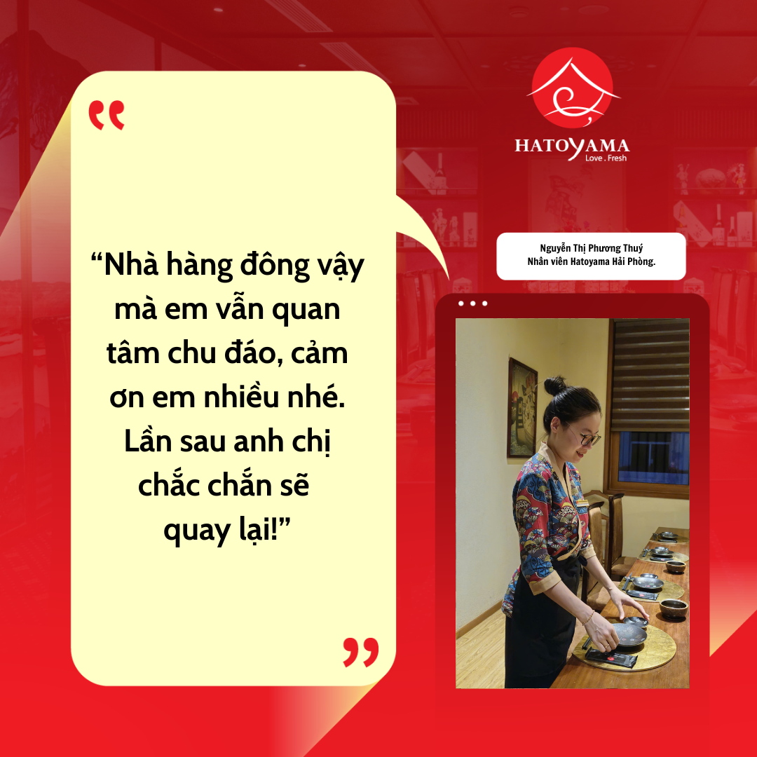 Tại Hatoyama, chúng tôi luôn đặt sự an tâm và thoải mái của thực khách lên hàng đầu. Câu chuyện từ bạn Nguyễn Thị Phương Thuý, nhân viên tại Hatoyama Hải Phòng, là minh chứng cho việc một hành động nhỏ, kịp thời có thể thay đổi hoàn toàn trải nghiệm của cả một gia đình.