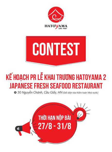 Cuộc thi “Kế hoạch PR lễ khai trương nhà hàng hải sản Nhật Hatoyama 2” dự kiến diễn ra vào ngày 20/9. Giải nhất: Gift Voucher trị giá 20,000,000đ sử dụng tại nhà hàng Hatoyama; Giải nhì: Gift Voucher trị