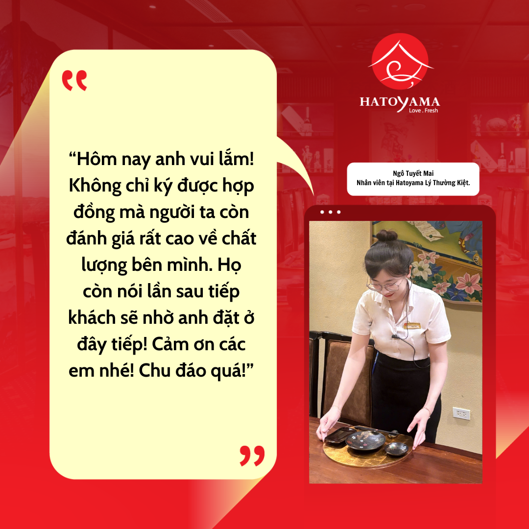 Tại Hatoyama, chúng tôi luôn coi trọng việc xây dựng mối quan hệ lâu dài với khách hàng thông qua sự thấu hiểu và phục vụ cá nhân hóa. Câu chuyện của bạn Ngô Tuyết Mai, nhân viên tại Hatoyama Lý Thường Kiệt, là minh chứng rõ nét cho triết lý này. Đó là hành trình biến những chi tiết nhỏ thành cầu nối mang lại hạnh phúc và thịnh vượng cho thực khách.