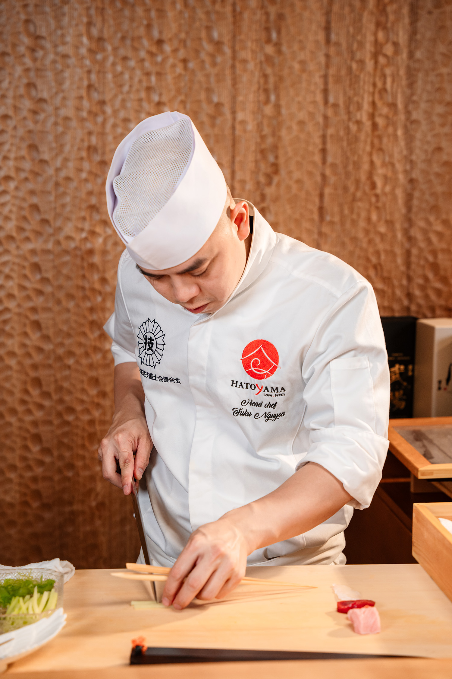 Trong ánh sáng tĩnh lặng của buổi sớm mai, khi căn bếp Hatoyama chưa thực sự bắt đầu nhịp điệu hối hả thường nhật, Bếp trưởng Fuku đứng đó, hoàn toàn chìm đắm trong thế giới của riêng mình. Trước mặt Chef không phải là một bàn tiệc thịnh soạn, mà là một chiếc đĩa nhỏ đựng những nhánh lá xanh non bé xíu.