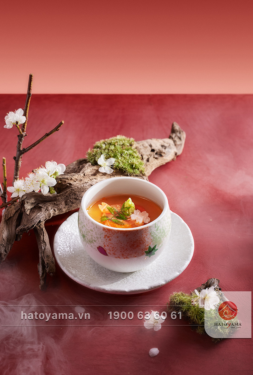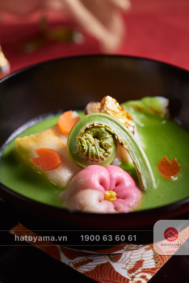 Một bức tranh xuân hiện ra ngay trước mắt: Trên nền súp màu xanh ngọc bích (được làm từ đậu xanh tươi non của mùa xuân) là lát Cá Tráp Sakura (Sakuradai) mang sắc hồng may mắn, tựa như cánh hoa anh đào rơi trên mặt hồ xanh biếc.