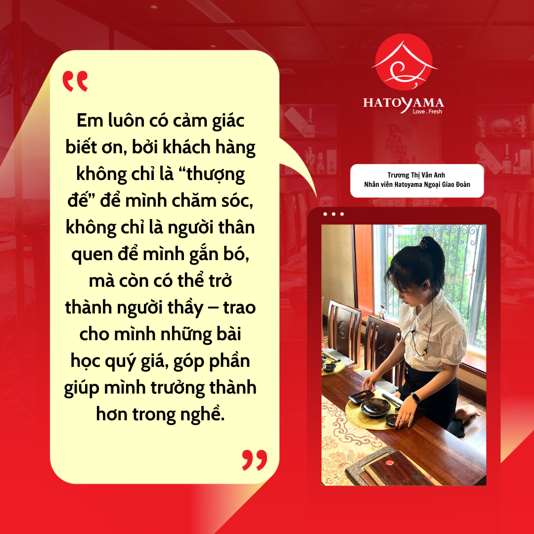 Tại Hatoyama, chúng tôi luôn tin rằng sự kết nối với khách hàng có thể vượt xa khuôn khổ của một giao dịch dịch vụ thông thường. Câu chuyện của bạn Trương Thị Vân Anh, nhân viên tại Hatoyama Ngoại Giao Đoàn, là một minh chứng cảm động về cách một thực khách có thể trở thành người thầy quý báu trên con đường phát triển sự nghiệp.