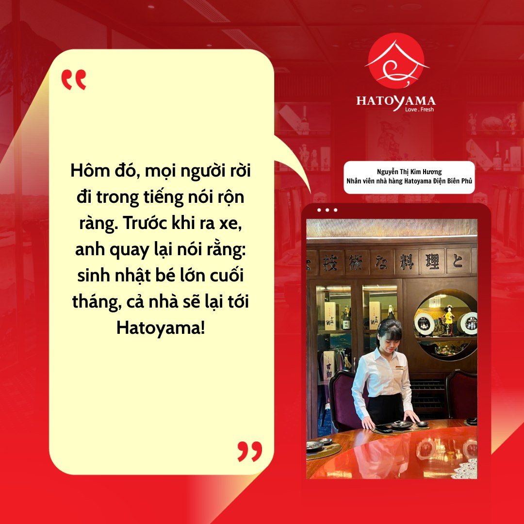 Tại Hatoyama, sự tinh tế nằm ở khả năng biến một bữa ăn đơn thuần thành một kỷ niệm đáng nhớ. Câu chuyện của bạn Nguyễn Thị Kim Hương, nhân viên tại Hatoyama Điện Biên Phủ, là minh chứng sống động cho việc tận tâm quan sát có thể tạo ra những niềm vui bất ngờ cho khách hàng.